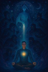 Cuando aprendemos a dejar circular el fuego sagrado por nuestros canales pasa lo que vemos en la imagen. Una poderosa luz alinea el canal central y entonces esos elementos psicológicos quedan visibles a la atestiguación de la consciencia y por ende a su disolución. Esa sencilla atestiguación sin intentar controlar o cambiar la cosa en sí es lo que produce un ver transformador.